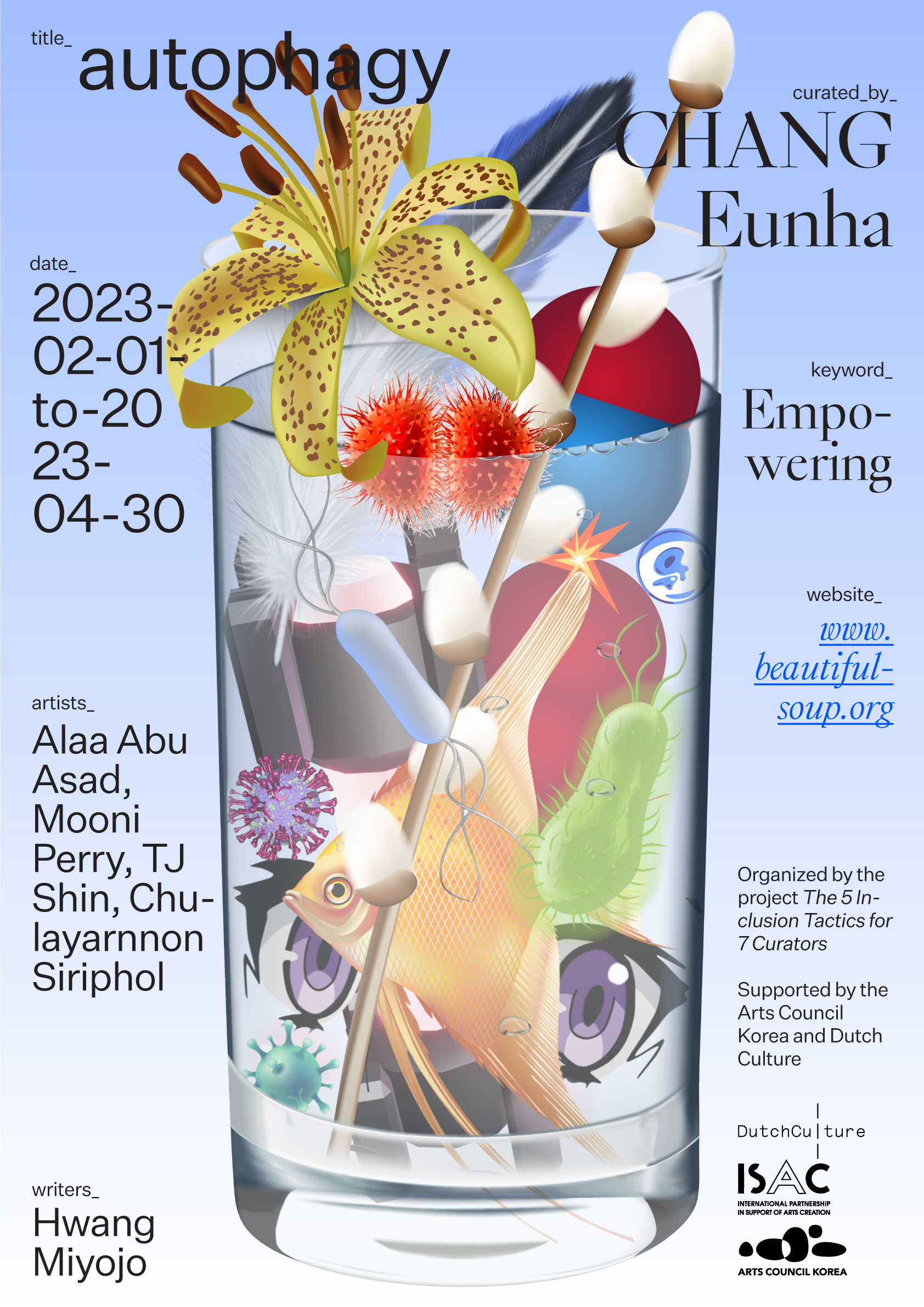 The curatorial project, Autophagy: Eating in Its Destructive and Creative Nature, is an experiment that takes the concept of 'autophagy'— a biological mechanism within the body—as a theoretical hypothesis as part of the larger curatorial project Inclusion and Innovation as Curatorial Practice: The 5 Inclusion Tactics for 7 Curators. Out of five given keywords: Cooperative, Empowering, Fair, Open, and Supportive, I selected 'empowering' to delve into. By combining this selected keyword with the concept of ‘autophagy’, the project explores the true nature of empowerment and what it means to truly empower someone or even the self.